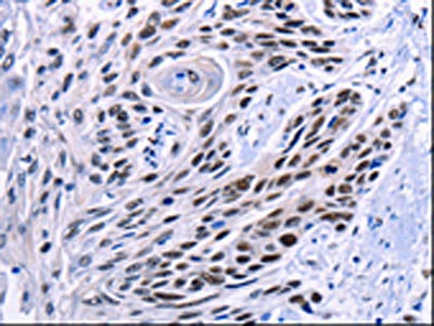 • The image on the left is immunohistochemistry of paraffin-embedded Human cervical cancer tissue using CSB-PA824713(CREBBP Antibody) at dilution 1/5, on the right is treated with synthetic peptide. (Original magnification: ×200)