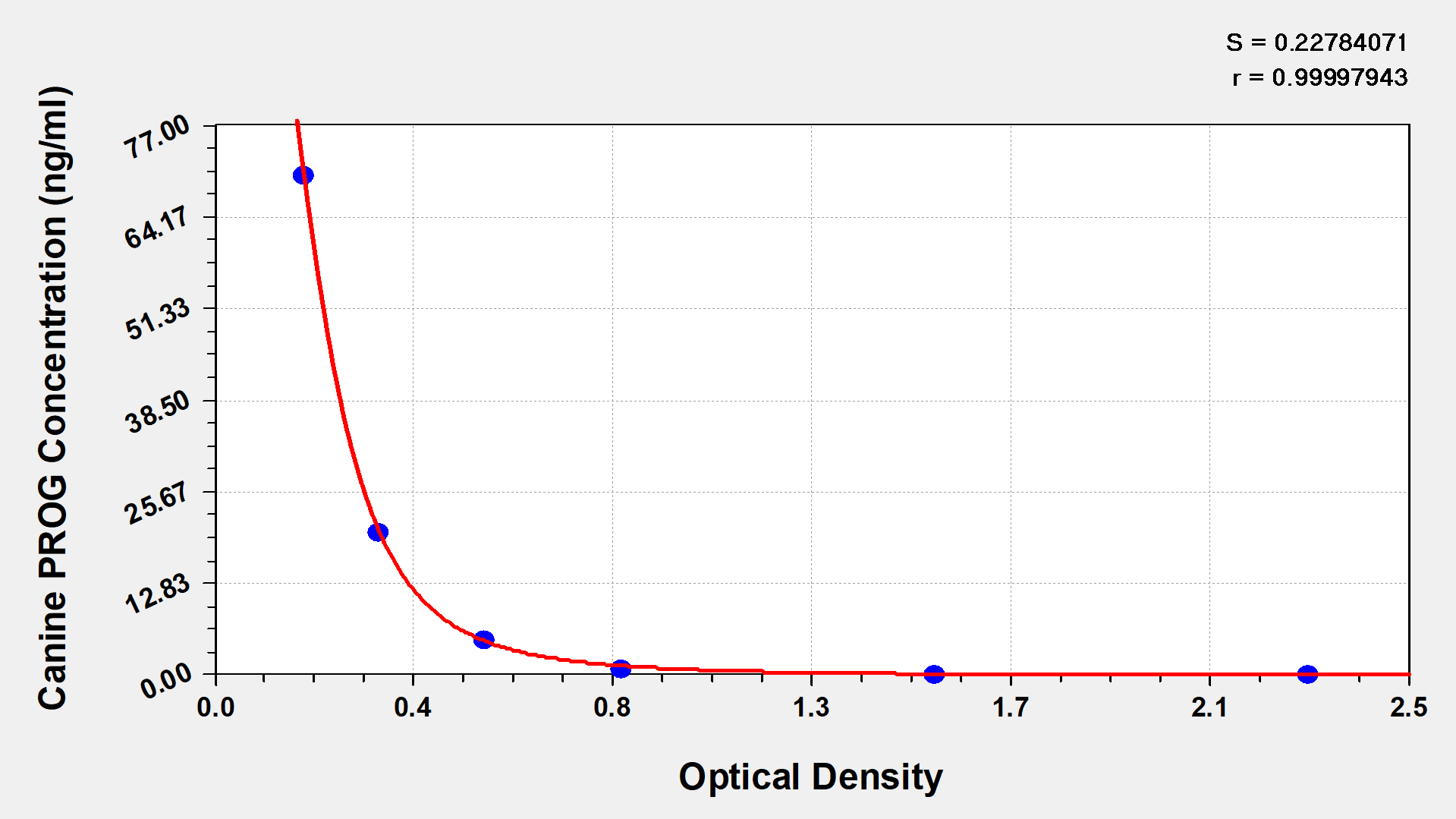 To assess the linearity of the assay, samples were spiked with high concentrations of canine PROG in various matrices and diluted with the Sample Diluent to produce samples with values within the dynamic range of the assay.