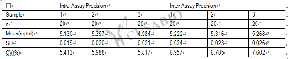 Three samples of known concentration were tested twenty times on one plate to assess.Inter-assay Precision (Precision between assays): CV%<10%Three samples of known concentration were tested in twenty assays to assess.