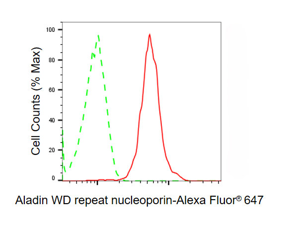 Flow cytometric analysis of Aladin WD repeat nucleoporin expression in HAP-1 cells using Aladin WD repeat nucleoporin antibody. Green, isotype control; red, Aladin WD repeat nucleoporin.