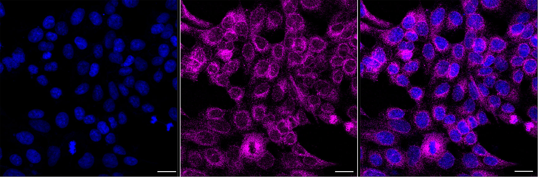 Immunocytochemical staining of HAP1 cells with Aladin WD repeat nucleoporin antibody. Nuclei were stained blue with DAPI; Aladin WD repeat nucleoporin was stained magenta with Alexa Fluor? 647. Images were taken using Leica stellaris 5. Protein abundance based on laser Intensity and smart gain: Medium. Scale bar, 20 μm.