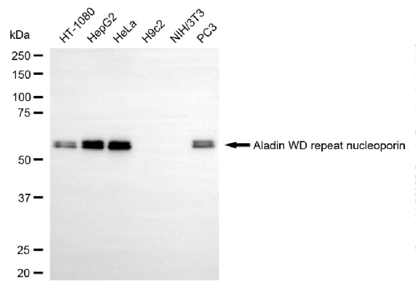 Western blotting analysis using aladin WD repeat nucleoporin antibody. Total cell lysates (30 μg) from various cell lines were loaded and separated by SDS-PAGE. The blot was incubated with aladin WD repeat nucleoporin antibody and HRP-conjugated goat anti-mouse secondary antibody respectively.
