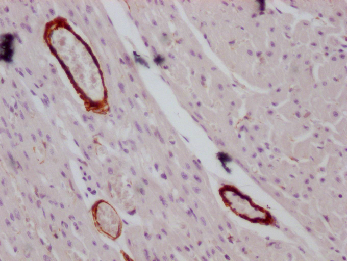 IHC image of CSB-MA166134 diluted at 1:100 and staining in paraffin-embedded human heart tissue performed on a Leica BondTM system. After dewaxing and hydration, antigen retrieval was mediated by high pressure in a citrate buffer (pH 6.0). Section was blocked with 10% normal goat serum 30min at RT. Then primary antibody (1% BSA) was incubated at 4°C overnight. The primary is detected by a Goat anti-mouse IgG polymer labeled by HRP and visualized using 0.05% DAB.