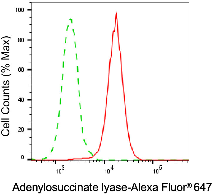 Flow cytometric analysis of Adenylosuccinate lyase expression in HeLa cells using Adenylosuccinate lyase antibody. Green, isotype control; red, Adenylosuccinate lyase.
