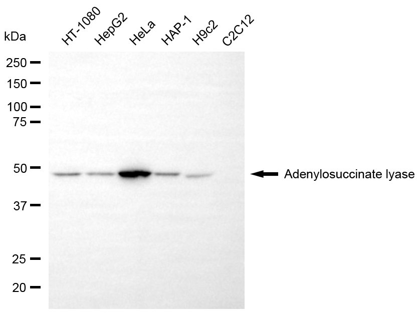 Western blotting analysis using adenylosuccinate lyase antibody. Total cell lysates (30 μg) from various cell lines were loaded and separated by SDS-PAGE. The blot was incubated with adenylosuccinate lyase antibody and HRP-conjugated goat anti-mouse secondary antibody respectively.