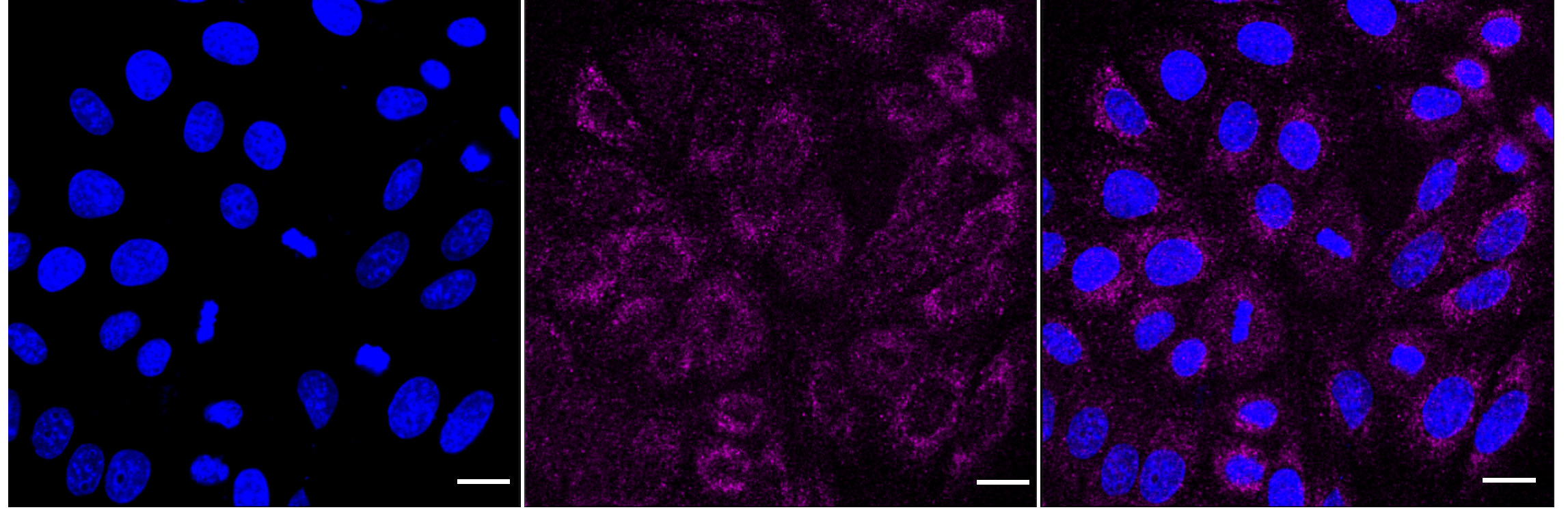 Immunocytochemical staining of HepG2 cells with ALPP antibody. Nuclei were stained blue with DAPI; ALPP was stained magenta with Alexa Fluor? 647. Images were taken using Leica stellaris 5. Protein abundance based on laser Intensity and smart gain: Low. Scale bar: 20 μm.