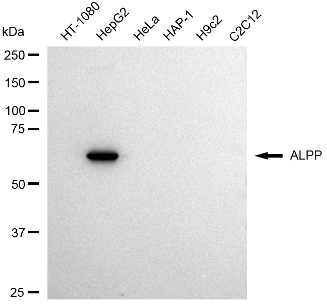 Western blotting analysis using ALPP antibody. Total cell lysates (30 μg) from various cell lines were loaded and separated by SDS-PAGE. The blot was incubated with ALPP antibody and HRP-conjugated goat anti-mouse secondary antibody respectively.