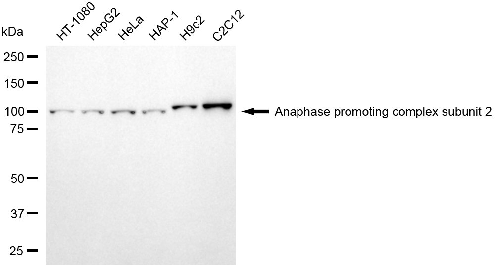 Western blotting analysis using anaphase promoting complex subunit 2 antibody. Total cell lysates (30 μg) from various cell lines were loaded and separated by SDS-PAGE. The blot was incubated with anaphase promoting complex subunit 2 antibody and HRP-conjugated goat anti-mouse secondary antibody respectively.
