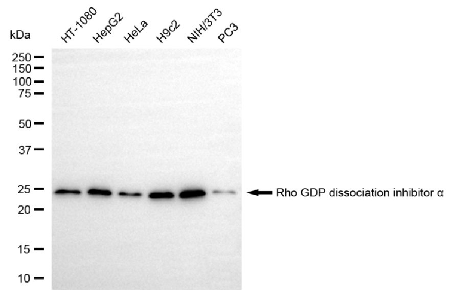 Western blotting analysis using Rho GDP dissociation inhibitor alpha antibody. Total cell lysates (30 μg) from various cell lines were loaded and separated by SDS-PAGE. The blot was incubated with Rho GDP dissociation inhibitor alpha antibody and HRP-conjugated goat anti-mouse secondary antibody respectively.