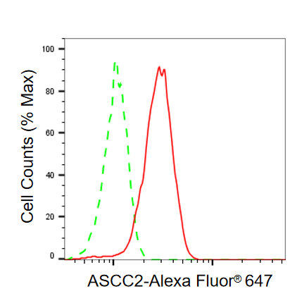 Flow cytometric analysis of ASCC2 expression in HepG2 cells using ASCC2 antibody. Green, isotype control; red, ASCC2.