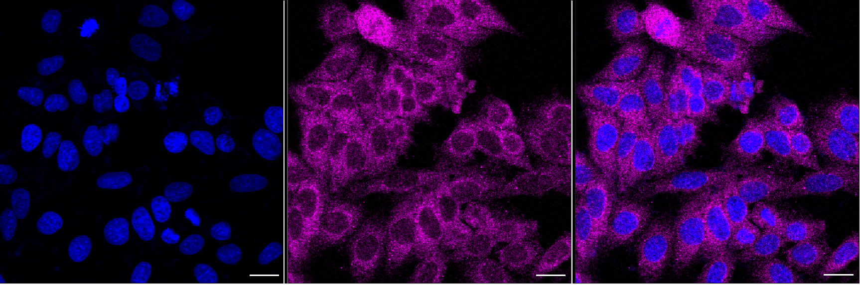 Immunocytochemical staining of HepG2 cells with ASCC2 antibody. Nuclei were stained blue with DAPI; ASCC2 was stained magenta with Alexa Fluor? 647. Images were taken using Leica stellaris 5. Protein abundance based on laser Intensity and Smart Gain: Low. Scale bar, 20 μm.