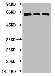 Western blot analysis of 1) 293T Cell Lysate, 2) C2C12 Cell Lysate, 3) Rat Brain Tissue Lysate using Beclin-1 Mouse mAb diluted at 1:2000.
