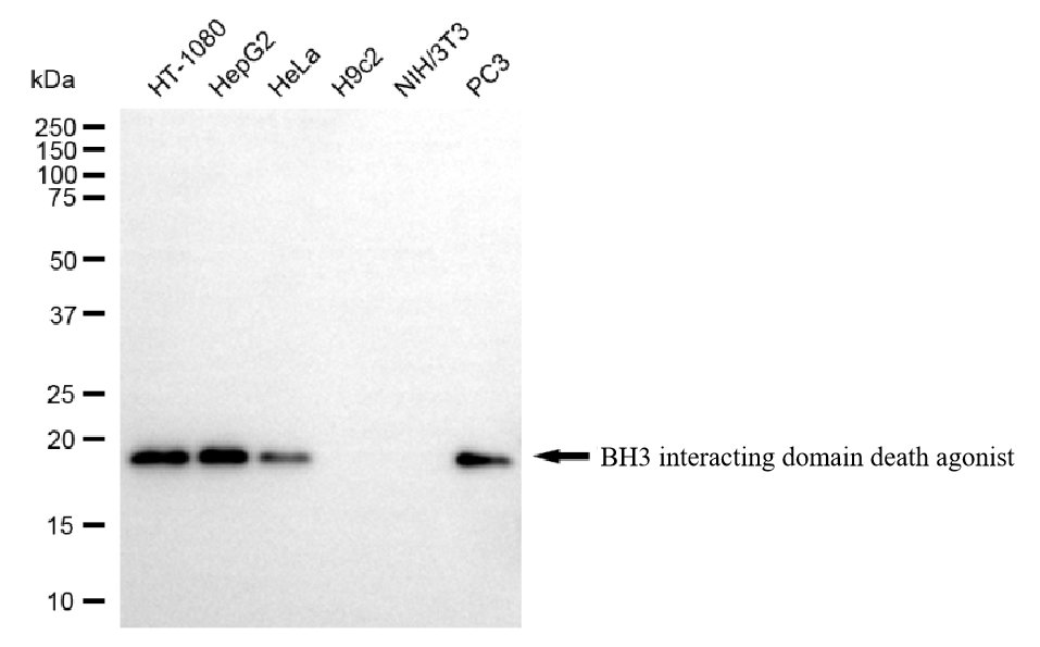 Western blotting analysis using BH3 interacting domain death agonist antibody. Total cell lysates (30 μg) from various cell lines were loaded and separated by SDS-PAGE. The blot was incubated with BH3 interacting domain death agonist antibody and HRP-conjugated goat anti-mouse secondary antibody respectively.