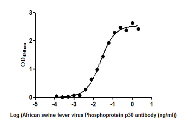 The Binding Activity of African swine fever virus Envelope protein p54 (Ba71V-126). Activity: Measured by its binding ability in a functional ELISA. Immobilized African swine fever virus Envelope protein p54 (Ba71V-126) protein at 2 μg/ml can bind African swine fever virus Envelope protein p54 (Ba71V-126) Antibody, the EC50 is 3.640 to 5.316 ng/ml.