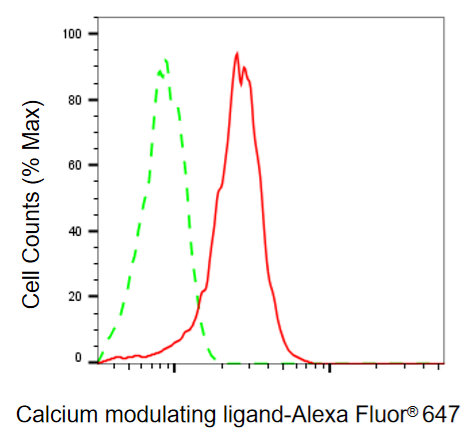Flow cytometric analysis of Calcium modulating ligand expression in HeLa cells using Calcium modulating ligand antibody. Green, isotype control; red, Calcium modulating ligand.