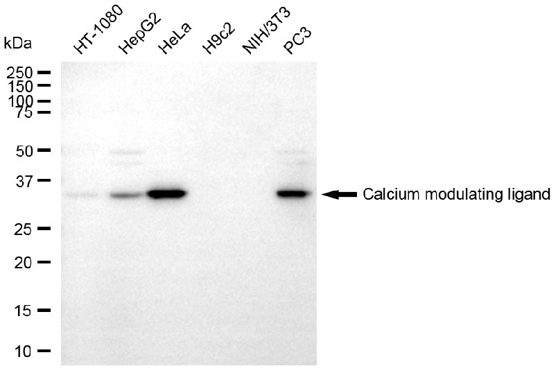 Western blotting analysis using calcium modulating ligand antibody. Total cell lysates (30 μg) from various cell lines were loaded and separated by SDS-PAGE. The blot was incubated with calcium modulating ligand antibody and HRP-conjugated goat anti-mouse secondary antibody respectively.