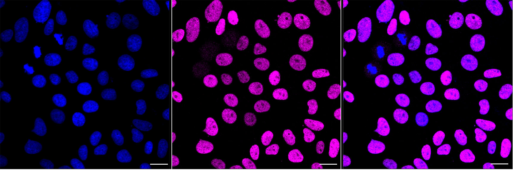 Immunocytochemical staining of HepG2 cells with Chromobox 3 antibody. Nuclei were stained blue with DAPI; Chromobox 3 was stained magenta with Alexa Fluor? 647. Images were taken using Leica stellaris 5. Protein abundance based on laser Intensity and smart gain: High. Scale bar, 20 μm.