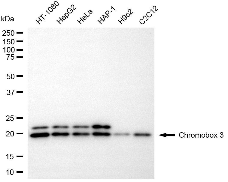 Western blotting analysis using chromobox 3 antibody. Total cell lysates (30 μg) from various cell lines were loaded and separated by SDS-PAGE. The blot was incubated with chromobox 3 antibody and HRP-conjugated goat anti-mouse secondary antibody respectively.