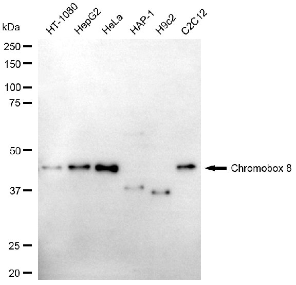 Western blotting analysis using chromobox 8 antibody. Total cell lysates (30 μg) from various cell lines were loaded and separated by SDS-PAGE. The blot was incubated with chromobox 8 antibody and HRP-conjugated goat mouse secondary antibody respectively.