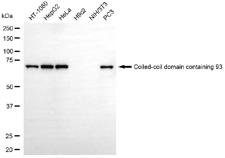 Western blotting analysis using coiled-coil domain containing 93 antibody. Total cell lysates (30 μg) from various cell lines were loaded and separated by SDS-PAGE. The blot was incubated with coiled-coil domain containing 93 antibody and HRP-conjugated goat anti-mouse secondary antibody respectively.