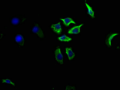 Immunofluorescence staining of HepG2 cells with CSB-MA004879A1m at 1:100, counter-stained with DAPI. The cells were blocked in 10% normal Goat Serum and then incubated with the primary antibody overnight at 4°C. The secondary antibody was Alexa Fluor 488-congugated AffiniPure Goat Anti-Mouse IgG(H+L).
