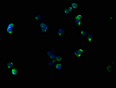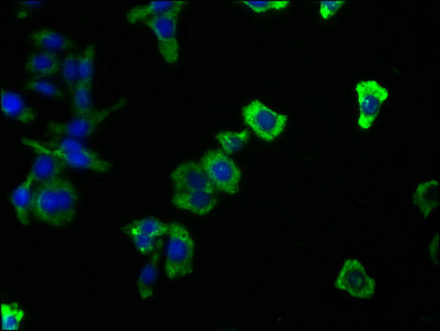 Immunofluorescence staining of Raw264.7 cells with CSB-MA004879A1m at 1:100, counter-stained with DAPI. The cells were blocked in 10% normal Goat Serum and then incubated with the primary antibody overnight at 4°C. The secondary antibody was Alexa Fluor 488-congugated AffiniPure Goat Anti-Mouse IgG(H+L).