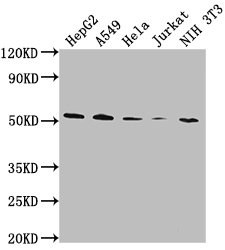 Positive WB detected in: HepG2 whole cell lysate, A549 whole cell lysate, Hela whole cell lysate, Jurkat whole cell lysate, NIH/3T3 whole cell lysate
