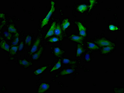 Immunofluorescence staining of Hela cells with CSB-MA017767A0m at 1:100, counter-stained with DAPI. The cells were blocked in 10% normal Goat Serum and then incubated with the primary antibody overnight at 4°C. The secondary antibody was Alexa Fluor 488-congugated AffiniPure Goat Anti-Mouse IgG(H+L).