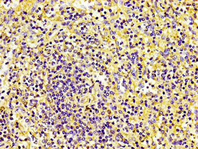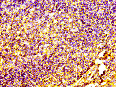 IHC image of CSB-MA017767A0m diluted at 1:100 and staining in paraffin-embedded human spleen tissue performed on a Leica BondTM system. After dewaxing and hydration, antigen retrieval was mediated by high pressure in a citrate buffer (pH 6.0). Section was blocked with 10% normal goat serum 30min at RT. Then primary antibody (1% BSA) was incubated at 4°C overnight. The primary is detected by a biotinylated secondary antibody and visualized using an HRP conjugated SP system.