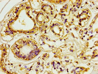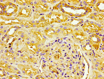 IHC image of CSB-MA017767A0m diluted at 1:100 and staining in paraffin-embedded human kidney tissue performed on a Leica BondTM system. After dewaxing and hydration, antigen retrieval was mediated by high pressure in a citrate buffer (pH 6.0). Section was blocked with 10% normal goat serum 30min at RT. Then primary antibody (1% BSA) was incubated at 4°C overnight. The primary is detected by a biotinylated secondary antibody and visualized using an HRP conjugated SP system.
