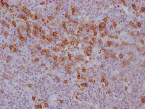 IHC image of CSB-MA785760 diluted at 1:100 and staining in paraffin-embedded human tonsil tissue performed on a Leica BondTM system. After dewaxing and hydration, antigen retrieval was mediated by high pressure in a citrate buffer (pH 6.0). Section was blocked with 10% normal goat serum 30min at RT. Then primary antibody (1% BSA) was incubated at 4°C overnight. The primary is detected by a Goat anti-mouse IgG polymer labeled by HRP and visualized using 0.05% DAB.