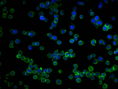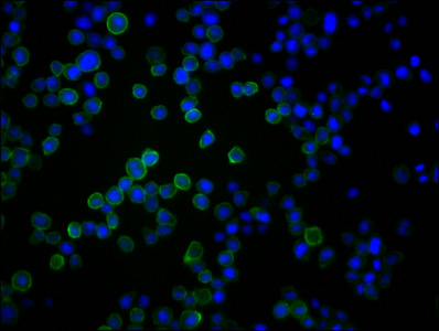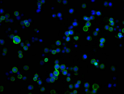 Immunofluorescence staining of Raji cells with CSB-MA019049A0m at 1:250, counter-stained with DAPI. The cells were incubated with the antibody overnight at 4°C. Nuclear DNA was labeled in blue with DAPI. The secondary antibody was FITC-conjugated AffiniPure Goat Anti-Mouse IgG (H+L).
