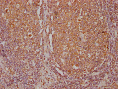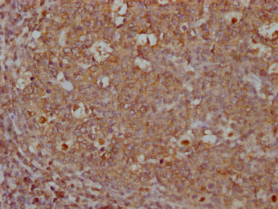 IHC image of CSB-MA019049A0m diluted at 1:500 and staining in paraffin-embedded human lymph node tissue performed on a Leica BondTM system. After dewaxing and hydration, antigen retrieval was mediated by high pressure in a citrate buffer (pH 6.0). Section was blocked with 10% normal goat serum 30min at RT. Then primary antibody (1% BSA) was incubated at 4°C overnight. The primary is detected by a Goat anti-rabbit IgG labeled by HRP and visualized using 0.05% DAB.