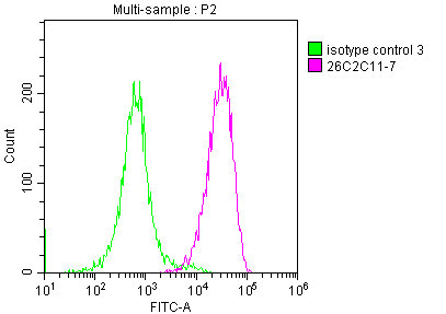 Overlay Peak curve showing JK cells stained with CSB-MA004941A1m (red line) at 1:200. The cells were incubated in 10% normal goat serum to block non-specific protein-protein interactions followed by the antibody (1μg/1*106cells) for 1h at 4°C. The secondary antibody used was FITC-conjugated Goat Anti-Mouse IgG(H+L) at 1/100 dilution for 30min at 4°C. Isotype control antibody (green line) was mouse IgG1 (1μg/1*106cells) used under the same conditions. Acquisition of >10,000 events was performed.