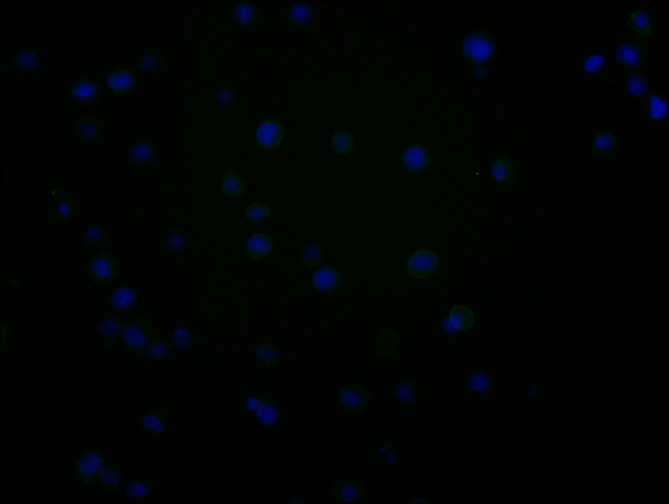 Immunofluorescence staining of JK cells with CSB-MA004941A1m at 1:100, counter-stained with DAPI. The cells were fixed in 4% formaldehyde and blocked in 10% normal Goat Serum. The cells were incubated with the antibody overnight at 4°C. Nuclear DNA was labeled in blue with DAPI. The secondary antibody was FITC-conjugated AffiniPure Goat Anti-Mouse IgG (H+L).