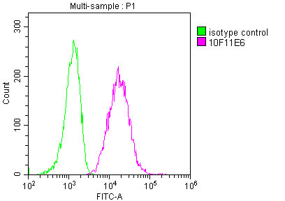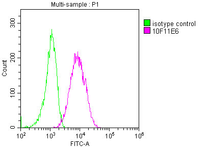 Overlay histogram showing A549 cells stained with CSB-MA004950A1m (red line) at 1:100. The cells were fixed in 4% formaldehyde and permeated by 0.2% TritonX-100. Then 10% normal goat serum was Incubated to block non-specific protein-protein interactions followed by the antibody (1μg/1*106cells) for 1 h at 4°C. The secondary antibody used was FITC-conjugated Goat Anti-Mouse IgG(H+L) at 1/100 dilution for 30min at 4°C. Isotype control antibody (green line) was mouse IgG2b (1μg/1*106cells) used under the same conditions. Acquisition of >10,000 events was performed.
