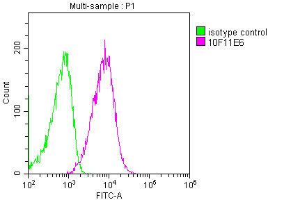 Overlay histogram showing Hela cells stained with CSB-MA004950A1m (red line) at 1:100. The cells were fixed in 4% formaldehyde and permeated by 0.2% TritonX-100. Then 10% normal goat serum was Incubated to block non-specific protein-protein interactions followed by the antibody (1μg/1*106cells) for 1 h at 4°C. The secondary antibody used was FITC-conjugated Goat Anti-Mouse IgG(H+L) at 1/100 dilution for 30min at 4°C. Isotype control antibody (green line) was mouse IgG2b (1μg/1*106cells) used under the same conditions. Acquisition of >10,000 events was performed.