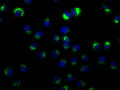 Immunofluorescence staining of A549 cells with CSB-MA004950A1m at 1:50, counter-stained with DAPI. The cells were fixed in 4% formaldehyde and blocked in 10% normal Goat Serum. The cells were then incubated with the antibody overnight at 4°C. Nuclear DNA was labeled in blue with DAPI. The secondary antibody was FITC-conjugated AffiniPure Goat Anti-Mouse IgG (H+L).