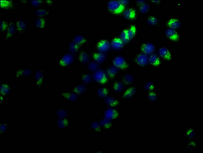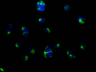 Immunofluorescence staining of Hela cells with CSB-MA004950A1m at 1:50, counter-stained with DAPI. The cells were fixed in 4% formaldehyde and blocked in 10% normal Goat Serum. The cells were then incubated with the antibody overnight at 4°C. Nuclear DNA was labeled in blue with DAPI. The secondary antibody was FITC-conjugated AffiniPure Goat Anti-Mouse IgG (H+L).