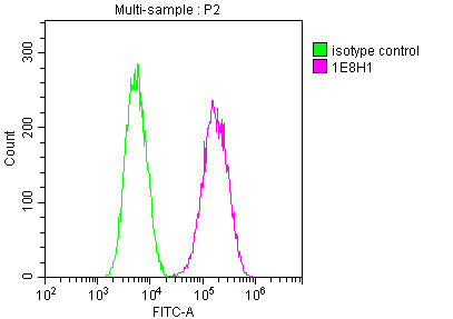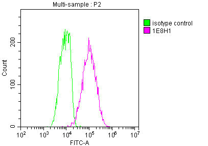 Overlay histogram showing Jurkat cells stained with CSB-MA004969A1m (red line) at 1:100. The cells were fixed in 4% formaldehyde and permeated by 0.2% TritonX-100. Then 10% normal goat serum was Incubated to block non-specific protein-protein interactions followed by the antibody (1μg/1*106cells) for 1 h at 4°C. The secondary antibody used was FITC-conjugated Goat Anti-Mouse IgG(H+L) at 1/100 dilution for 30min at 4°C. Isotype control antibody (green line) was mouse IgG1(1μg/1*106cells) used under the same conditions. Acquisition of >10,000 events was performed.