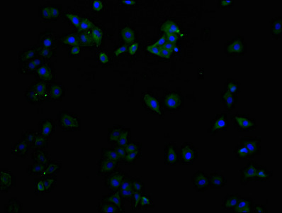 Immunofluorescence staining of HepG2 cells with CSB-MA004969A1m at 1:50, counter-stained with DAPI. The cells were fixed in 4% formaldehyde and blocked in 10% normal Goat Serum. The cells were then incubated with the antibody overnight at 4°C. Nuclear DNA was labeled in blue with DAPI. The secondary antibody was FITC-conjugated AffiniPure Goat Anti-Mouse IgG (H+L).