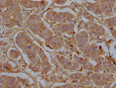 IHC image of CSB-MA004969A1m diluted at 1:50 and staining in paraffin-embedded human breast cancer tissue performed on a Leica BondTM system. After dewaxing and hydration, antigen retrieval was mediated by high pressure in a citrate buffer (pH 6.0). Section was blocked with 10% normal goat serum 30min at 37°C. Then primary antibody (1% BSA) was incubated at 4°C overnight. The primary is detected by a Goat anti-rabbit IgG labeled by HRP and visualized using 0.05% DAB.