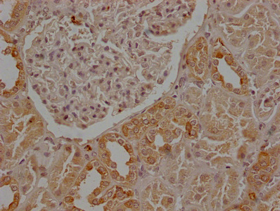 IHC image of CSB-MA004969A1m diluted at 1:50 and staining in paraffin-embedded human kidney tissue performed on a Leica BondTM system. After dewaxing and hydration, antigen retrieval was mediated by high pressure in a citrate buffer (pH 6.0). Section was blocked with 10% normal goat serum 30min at 37°C. Then primary antibody (1% BSA) was incubated at 4°C overnight. The primary is detected by a Goat anti-rabbit IgG labeled by HRP and visualized using 0.05% DAB.