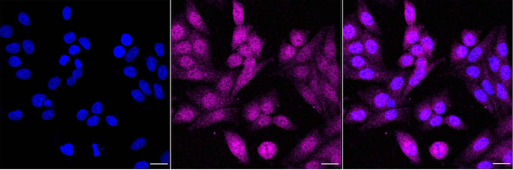 Immunocytochemical staining of HepG2 cells with Cell division cycle 123 antibody. Nuclei were stained blue with DAPI; Cell division cycle 123 was stained magenta with Alexa Fluor? 647. Images were taken using Leica stellaris 5. Protein abundance based on laser Intensity and Smart Gain: Low. Scale bar, 20 μm.