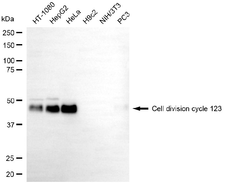 Western blotting analysis using cell division cycle 123 antibody. Total cell lysates (30 μg) from various cell lines were loaded and separated by SDS-PAGE. The blot was incubated with cell division cycle 123 antibody and HRP-conjugated goat anti-rabbit secondary antibody respectively.
