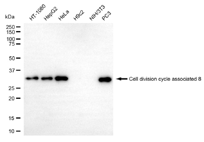 Western blotting analysis using cell division cycle associated 8 antibody. Total cell lysates (30 μg) from various cell lines were loaded and separated by SDS-PAGE. The blot was incubated with cell division cycle associated 8 antibody and HRP-conjugated goat anti-mouse secondary antibody respectively.