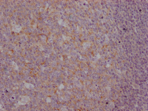 IHC image of CSB-MA916751 diluted at 1:100 and staining in paraffin-embedded human tonsil tissue performed on a Leica BondTM system. After dewaxing and hydration, antigen retrieval was mediated by high pressure in a citrate buffer (pH 6.0). Section was blocked with 10% normal goat serum 30min at RT. Then primary antibody (1% BSA) was incubated at 4°C overnight. The primary is detected by a Goat anti-mouse IgG polymer labeled by HRP and visualized using 0.05% DAB.