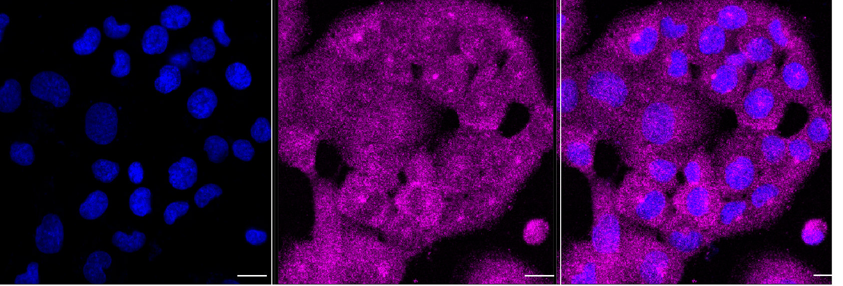 Immunocytochemical staining of HepG2 cells with Casein kinase 1 epsilon antibody. Nuclei were stained blue with DAPI; Casein kinase 1 epsilon was stained magenta with Alexa Fluor? 647. Images were taken using Leica stellaris 5. Protein abundance based on laser Intensity and smart gain: Medium. Scale bar, 20 μm.