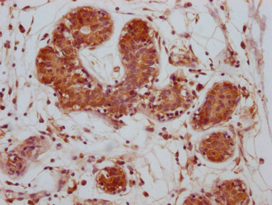 IHC image of CSB-MA006163A0m diluted at 1:500 and staining in paraffin-embedded human breast cancer performed on a Leica BondTM system. After dewaxing and hydration, antigen retrieval was mediated by high pressure in a citrate buffer (pH 6.0). Section was blocked with 10% normal goat serum 30min at 37°C Then primary antibody (1% BSA) was incubated at 4°C overnight. The primary is detected by a Goat anti-Mouse IgG labeled by HRP and visualized using 0.05% DAB.