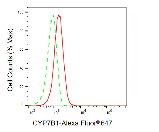 Flow cytometric analysis of CYP7B1 expression in HAP-1 cells using CYP7B1 antibody. Green, isotype control; red, CYP7B1.